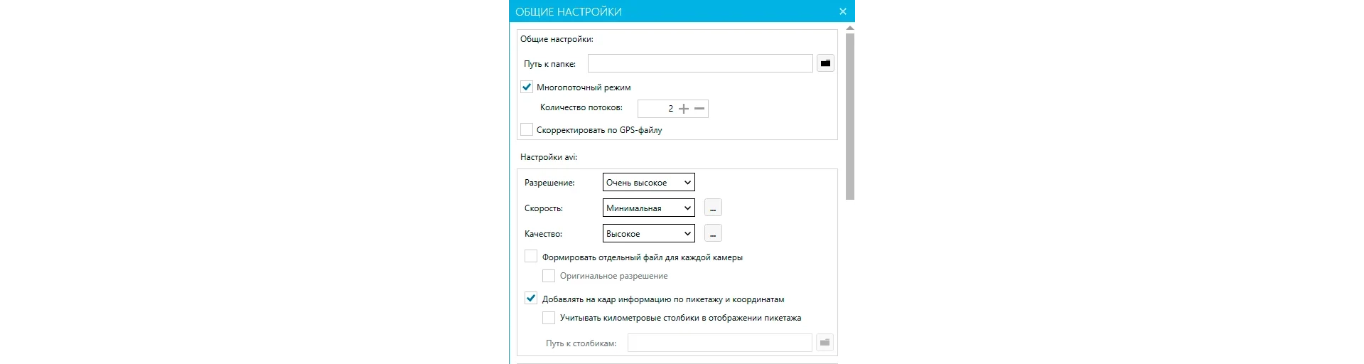 • Гибкие настройки, позволяющие конвертировать видео с заданным разрешением, скоростью и качеством изображения, а также корректировать видео по эталонному GPS сразу во время конвертирования