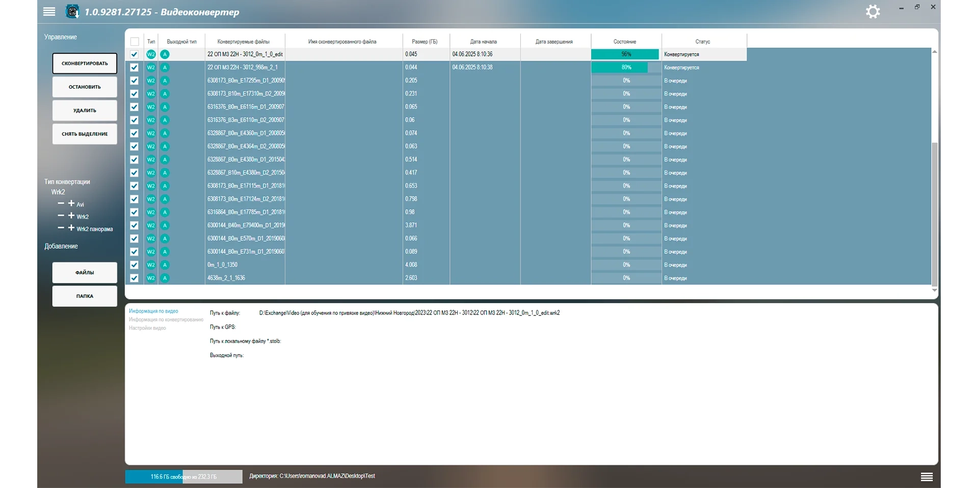 Видеоконвертер предназначен для конвертирования формата *.wrk/*wrk2 в простой и общедоступный формат *.avi с отображением на кадре географических координат и километража проезда лаборатории.