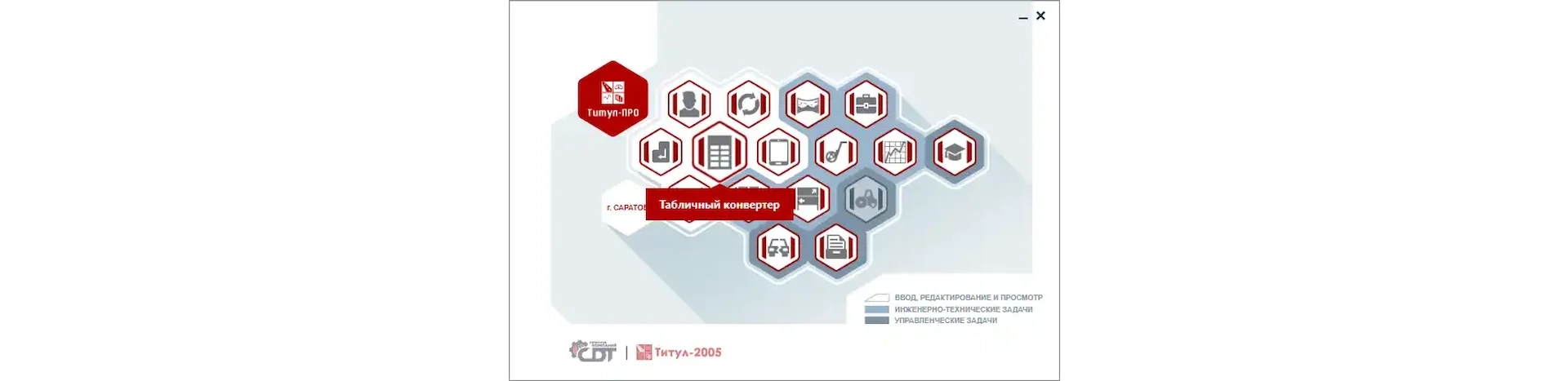 Модуль предназначен для переноса информации из файлов формата MS Excel в таблицы и справочники базы дорожных данных «Титул-2005». Табличный конвертер был разработан с целью экономии время пользователя на занесении информации в базу данных, то есть имея информацию по тому или иному объекту в табличном виде (файлы формата *.xls или *.xlsx) можно оперативно занести эти объекты как по одной, так и по сети автомобильных дорог.
