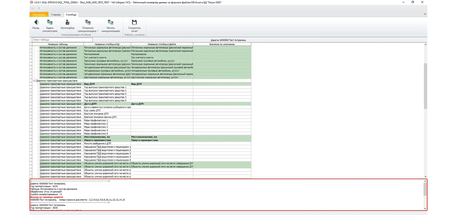 После конвертирования данных в поле отчета главного окна программы сформируется сообщение о результате завершения процесса, здесь отобразятся ошибочные данные, например, когда запись будет выходить за пределы границ автомобильной дороги в базе данных.