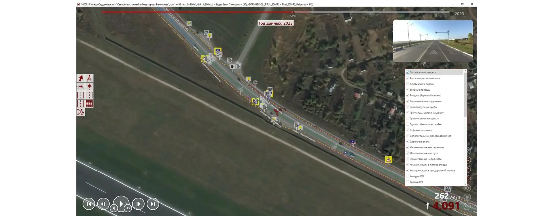 • Отображать текущее местоположение видеопроезда на электронной карте с возможностью выбора картографической подложки или цифрового ортофотоплана высокого разрешения, для удобства ориентирования на местности, изучения локальной ситуации и уточнения особенностей объектов на автомобильной дороге