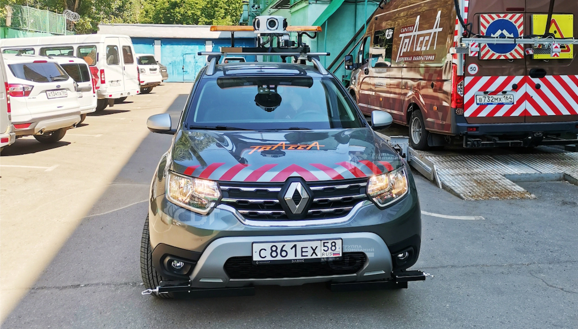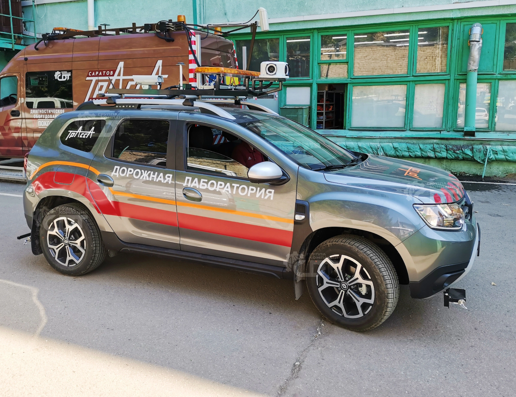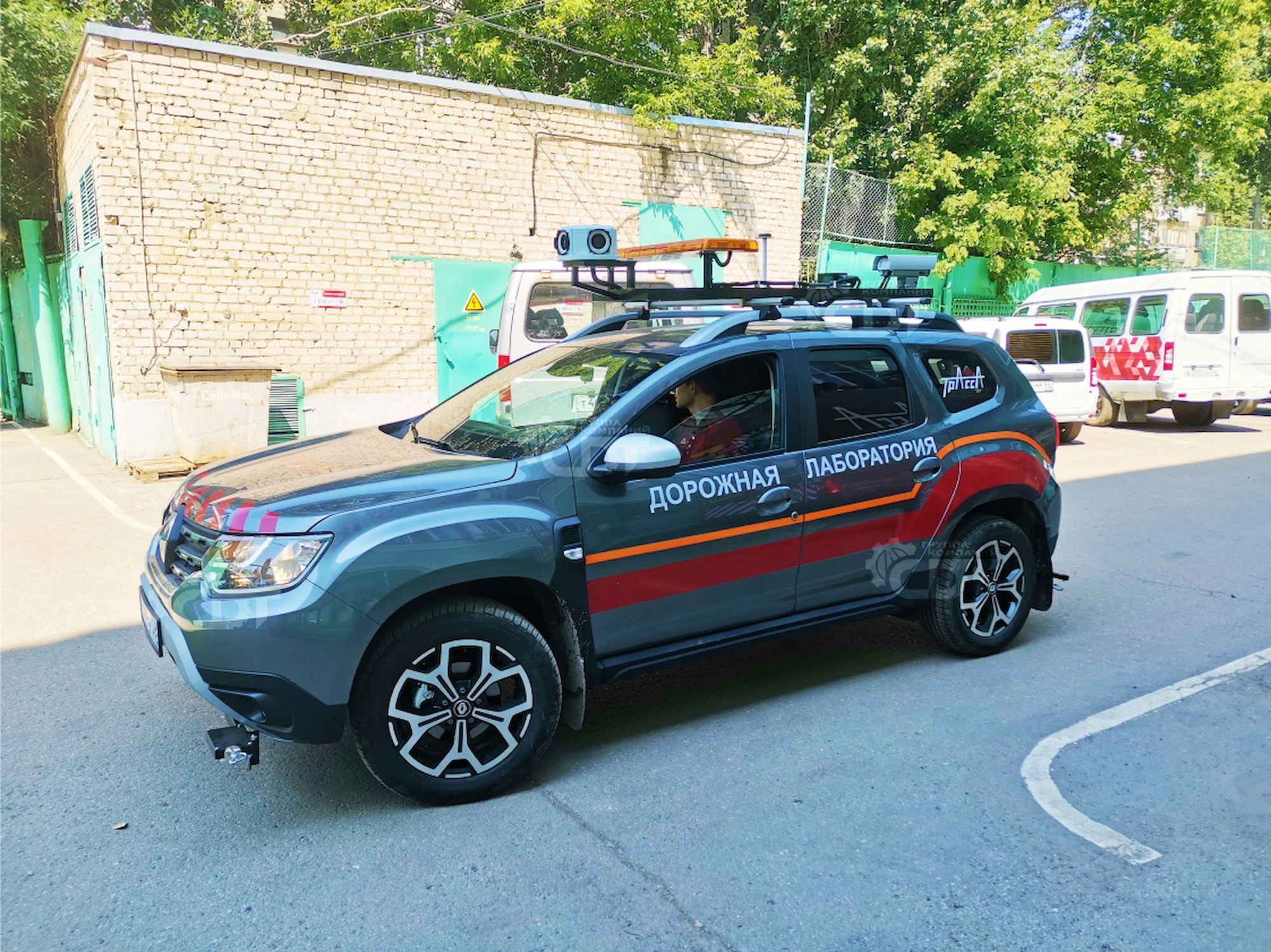 Лаборатория на базе автомобиля Renault Duster оснащена системой панорамной видеосъемки автомобильных дорог, выполненной на основе 4-х отдельных камер в индивидуальном кожухе, направленных по ходу движения и одной камеры, направленной против хода.