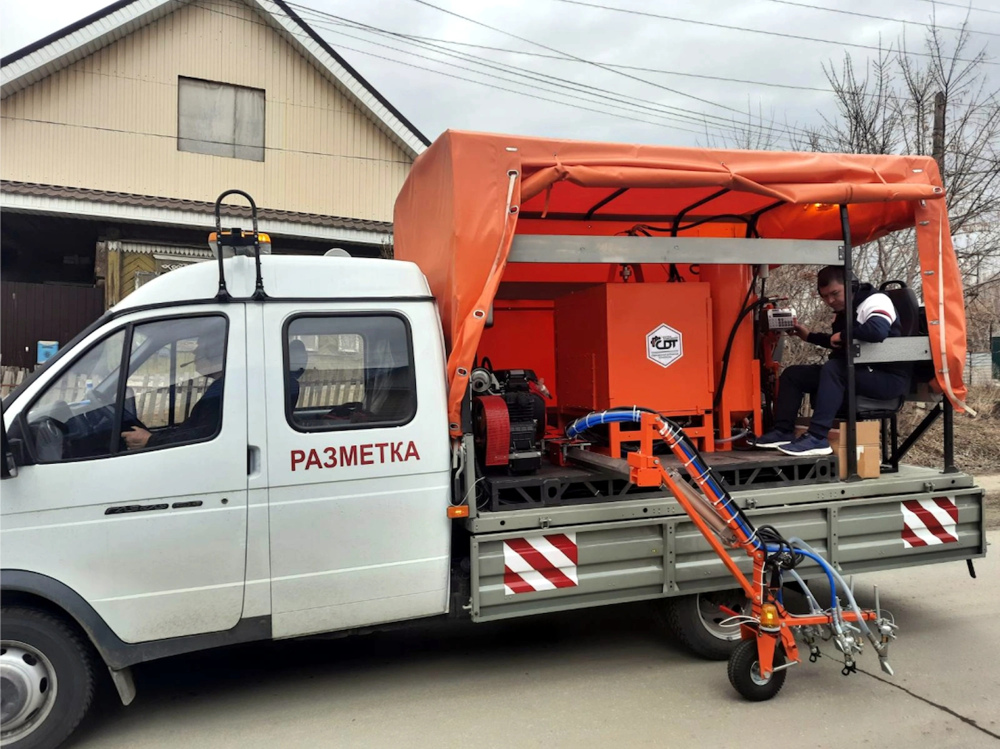 Специалисты Группы компаний «СДТ» для города Южноуральск оборудовали на базе автомобиля Газель со сдвоенной кабиной разметочную машину «Стрела-К». Она предназначена для выполнения работ по нанесению горизонтальной разметки на автомобильных дорогах дорожными красками «безвоздушным» способом.