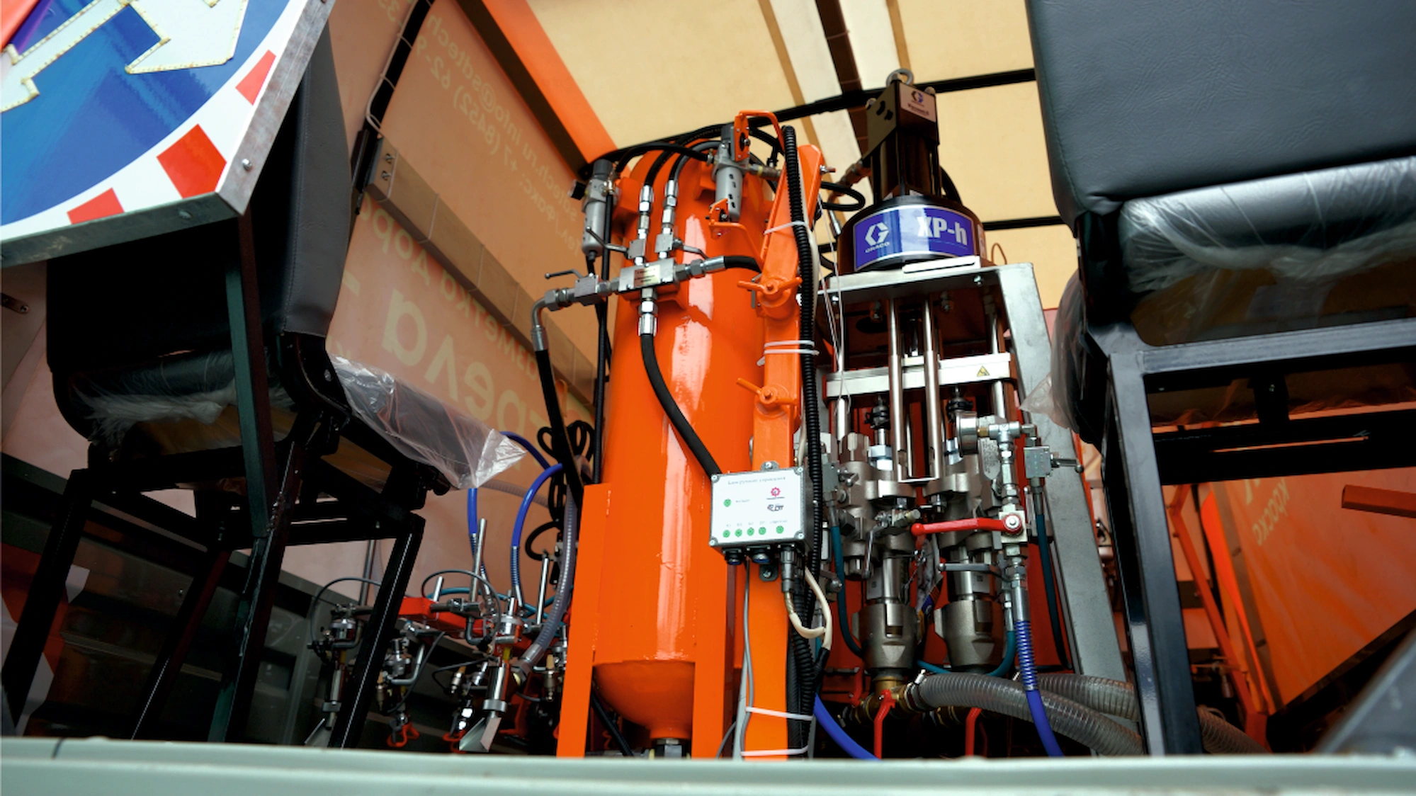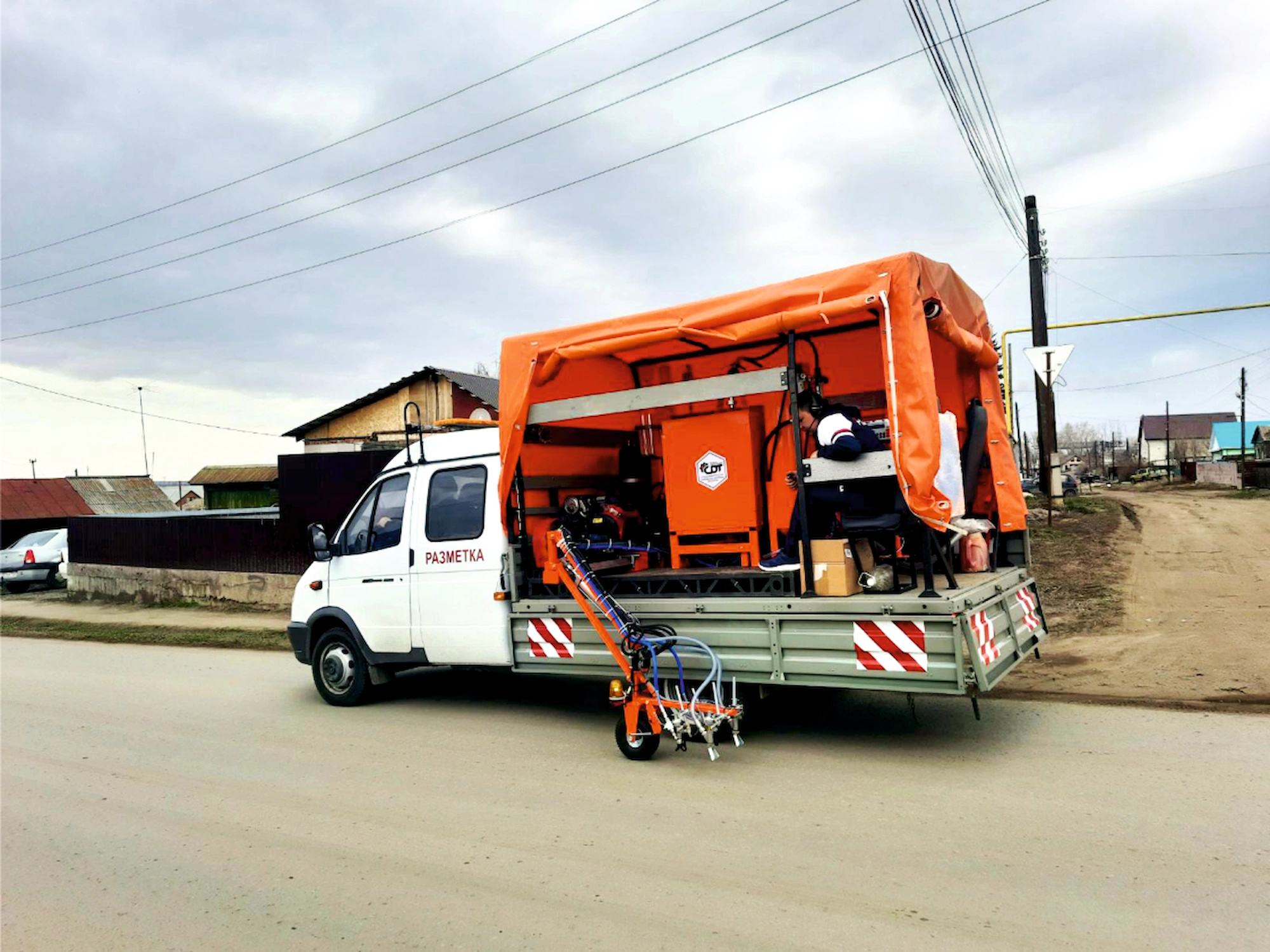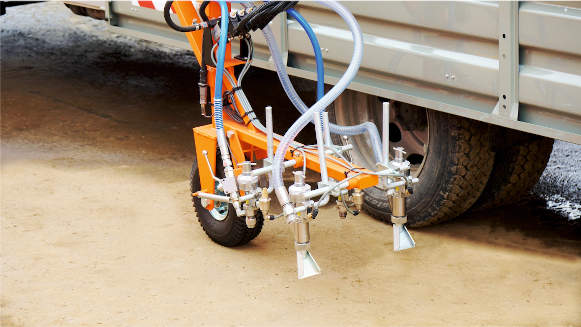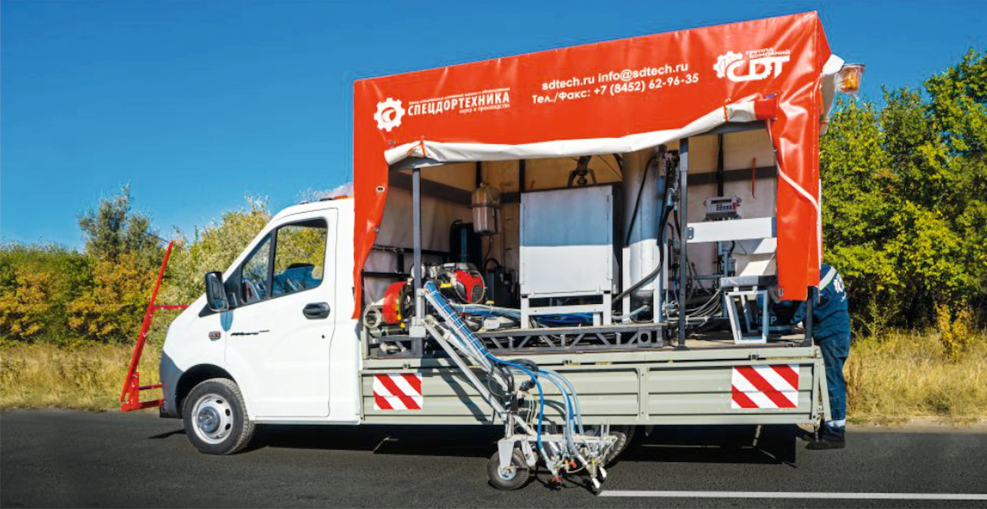 В составе поставляемой техники была изготовлена универсальная разметочная машина, позволяющая работать как со всеми видами дорожных красок, так и с «холодным» двухкомпонентным пластиком (в соотношении 50/50).