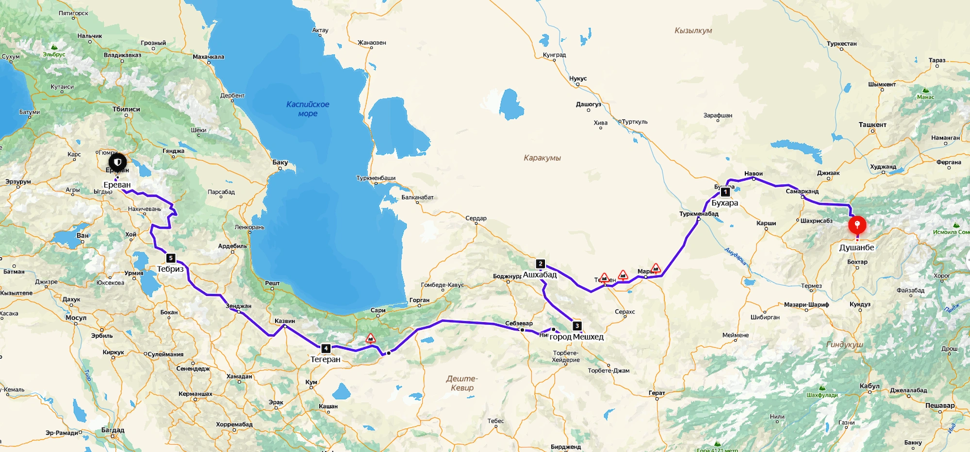 Автопробег пройдет с 24 апреля по 10 мая 2023 года по маршруту: Душанбе – Айни – Пенджикент – гр. Таджикистана с Узбекистаном – Самарканд – Навои – Бухара – гр. Узбекистана с Туркменистаном – Туркменабад – Мары – Ашхабад – гр. Туркменистана с Ираном – Мешхед – Нишапур – Семнан – Тегеран – Тебриз – гр. Туркменистана с Ираном – Мегри – Капан – Ереван, общая протяженность составит около 4000 км.