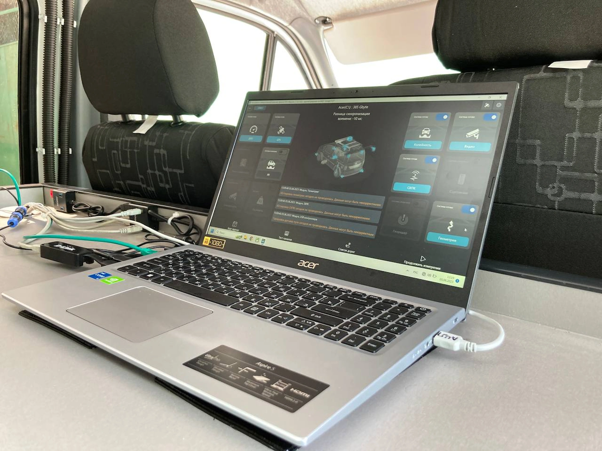 В комплектации лаборатории ноутбук с программным обеспечением, позволяющим фиксировать дату и время тарировки и юстировки датчиков (пути, видеосъемка, колейность, геометрия и т.д ), начало и конец измерений, позволяет вести бортовой журнал, осуществляет передачу видеоданных и результатов работы всех измерительных систем комплекса в базу дорожных данных "Титул-2005" и данные измерений: