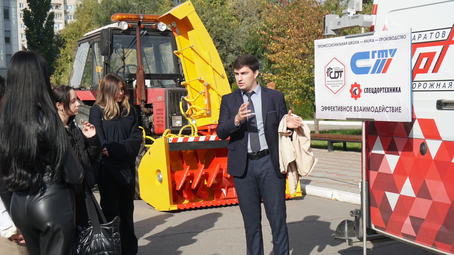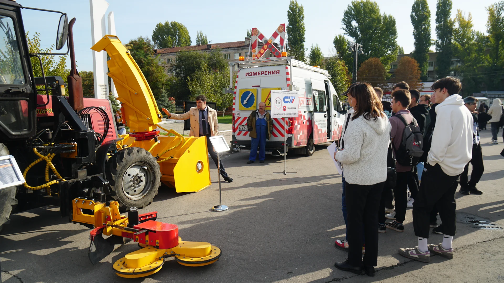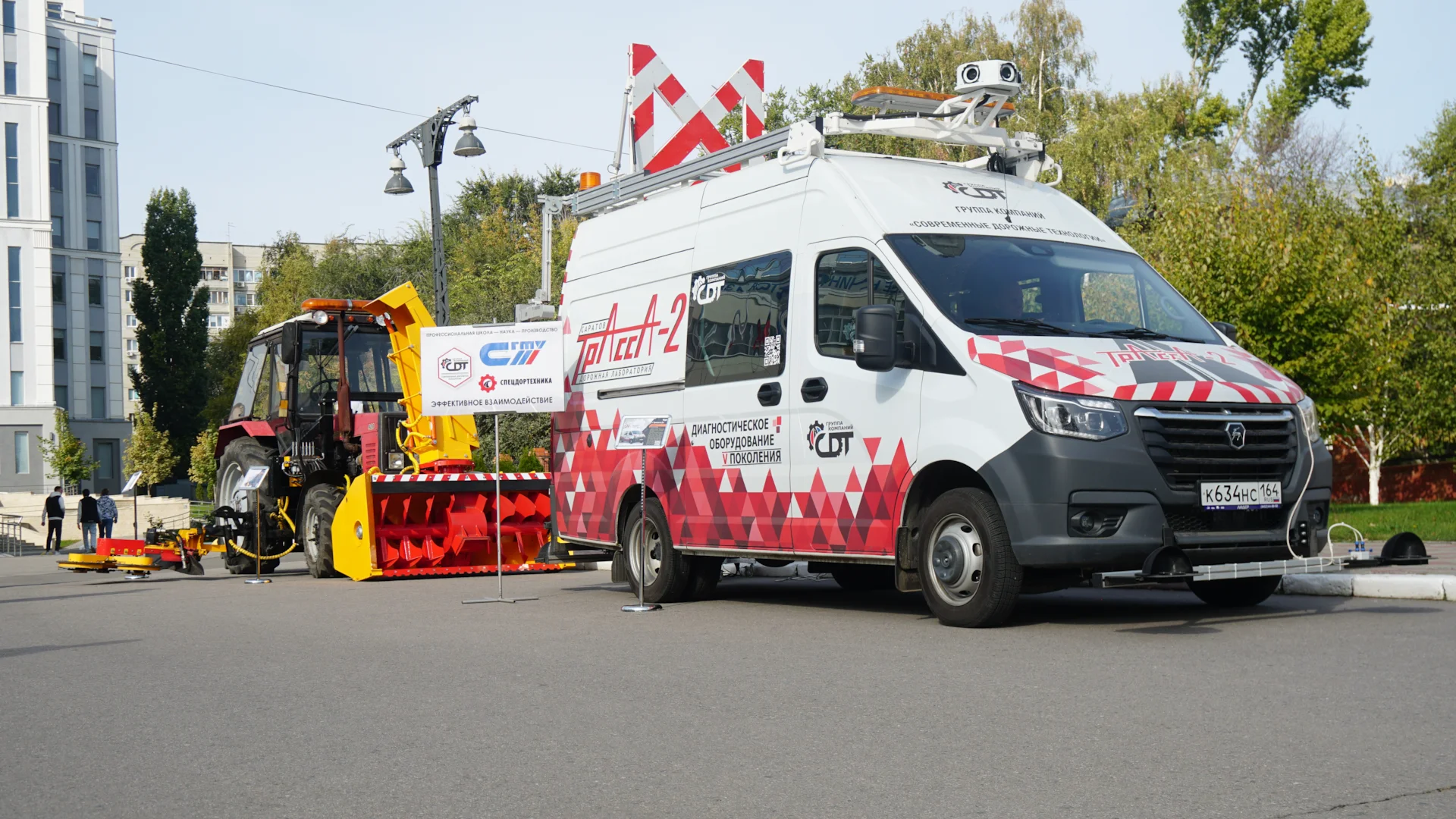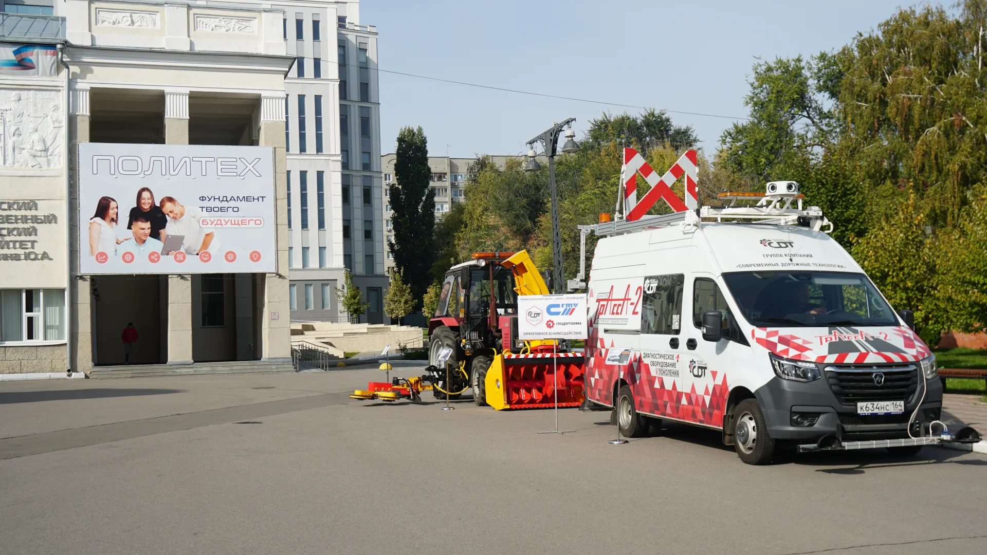 6 октября 2023 г. прошел Всероссийский Фестиваль «НАУКА» на базе Саратовского государственного технического университета имени А.Ю. Гагарина. Лекции, конкурсы, викторины, мастер-классы, демонстрации опытов и современных технологий – ожидали посетителей фестиваля. Группа Компаний «Современные дорожные технологии» приняла участие в Фестивале. На площади перед главным корпусом СГТУ расположилась экспозиция ГК «СДТ» - Комплексная дорожная лаборатория ТРАССА-2, трактор с навесным дорожным оборудованием СПИННЕР и БУРАН-3. Оборудование вызвало живой интерес учащихся, студентов и молодых специалистов.
