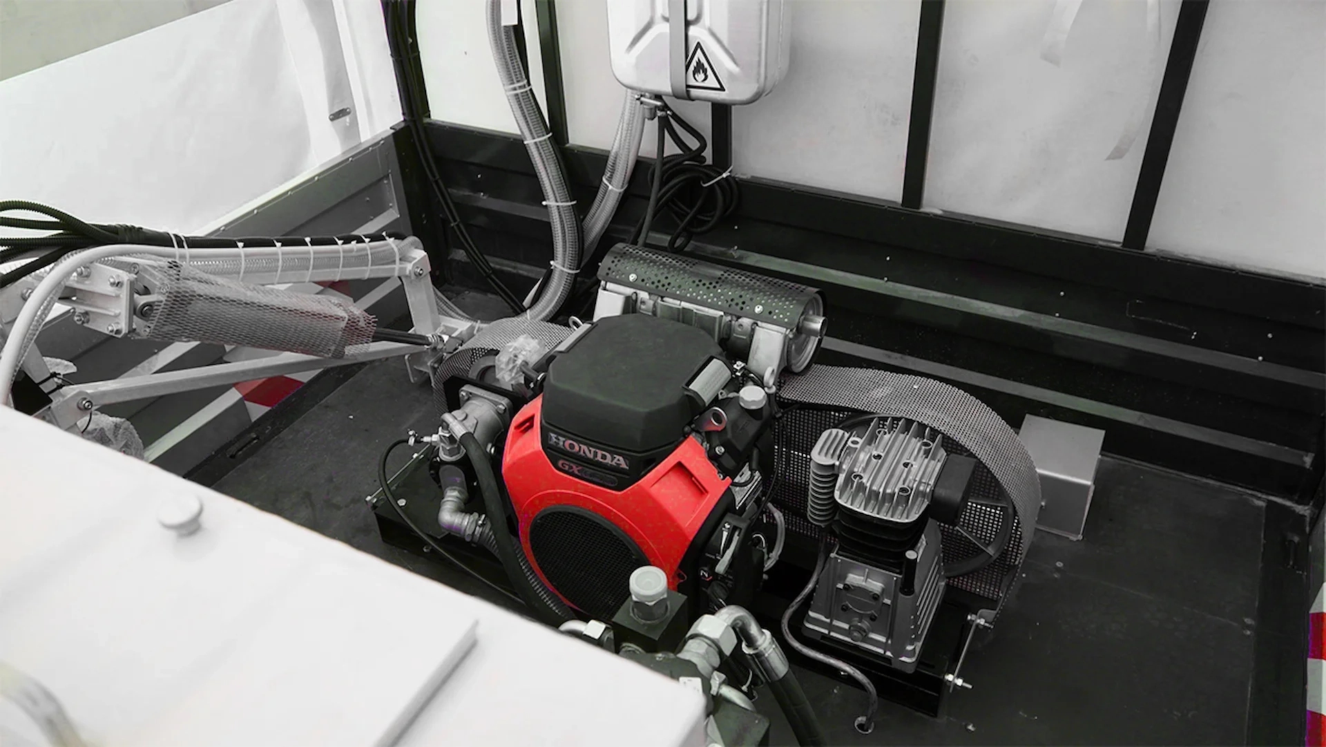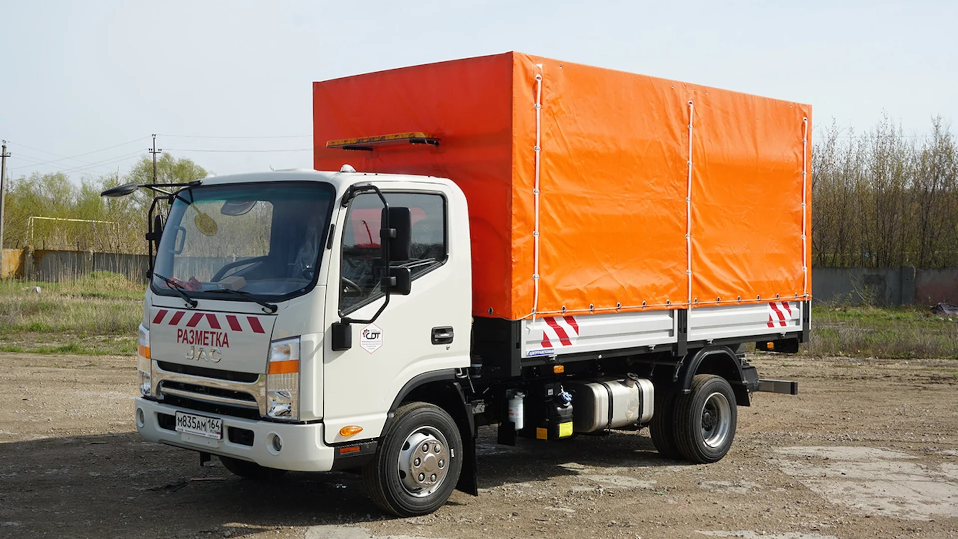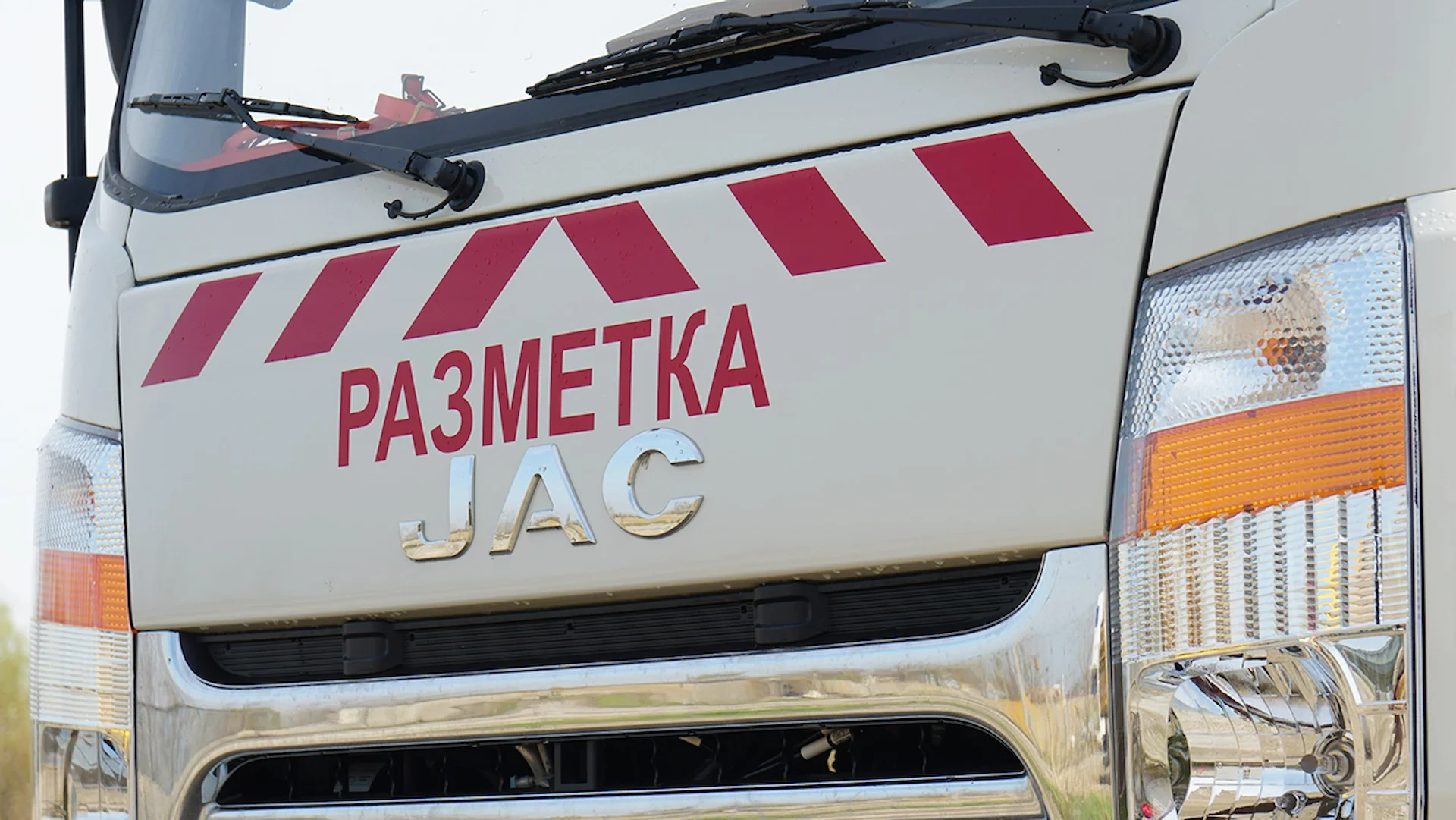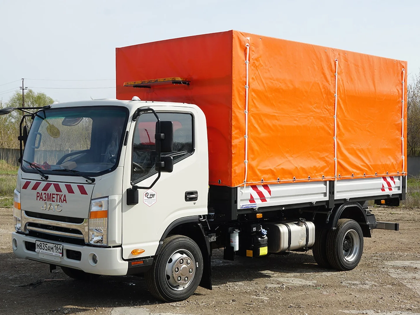 В качестве базового шасси был использован автомобиль JAC. Разметочная машина "Стрела-К" предназначена для выполнения работ по нанесению горизонтальной разметки на автомобильных дорогах дорожными красками "безвоздушным" способом.