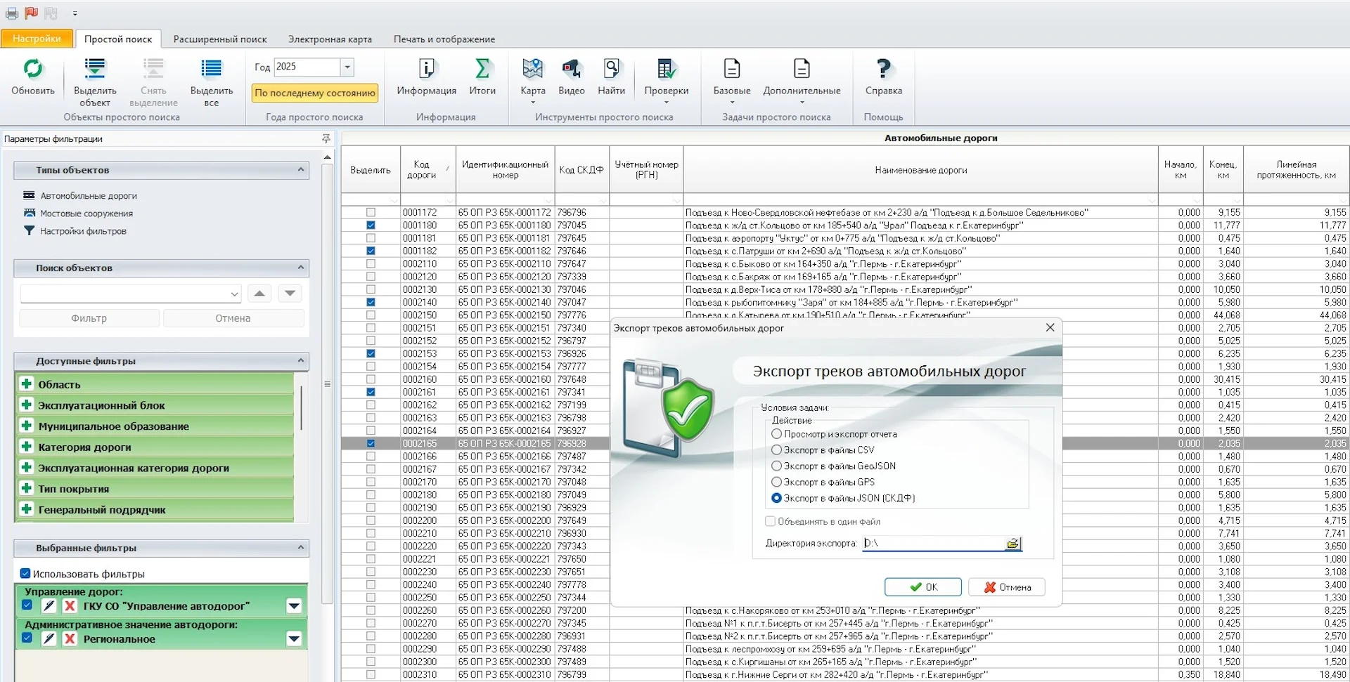 1.Разработали специализированную функцию "Экспорт треков автомобильных дорог" в формате JSON, строго соответствующая требованиям Системы контроля за формированием и использованием средств дорожных фондов (ФГИС СКДФ).