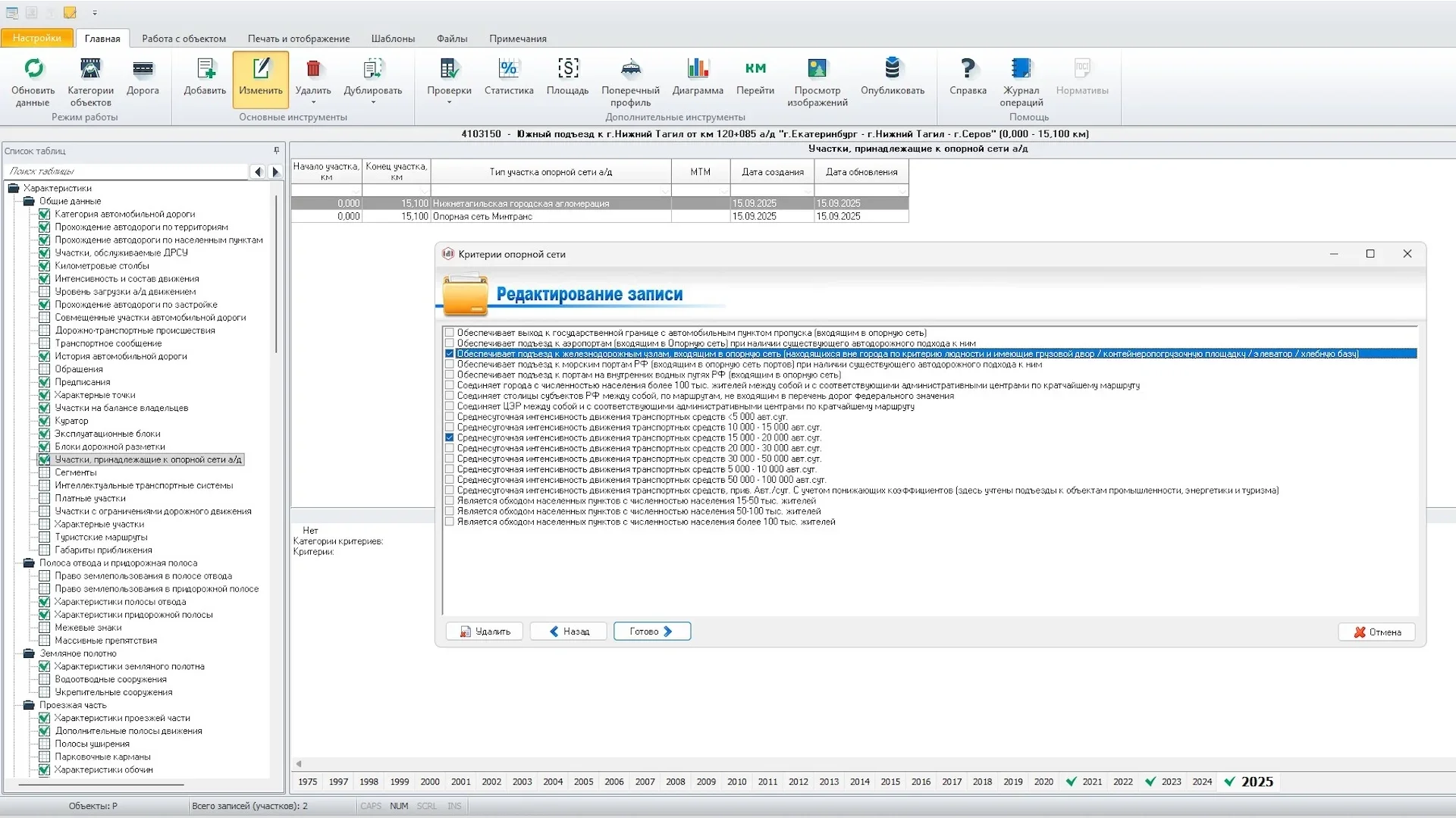 2. Доработали таблицу "Участки, принадлежащие к опорной сети а/д" путём добавление поля "Категории критерия опорной сети" и сами "Критерии опорной сети"
