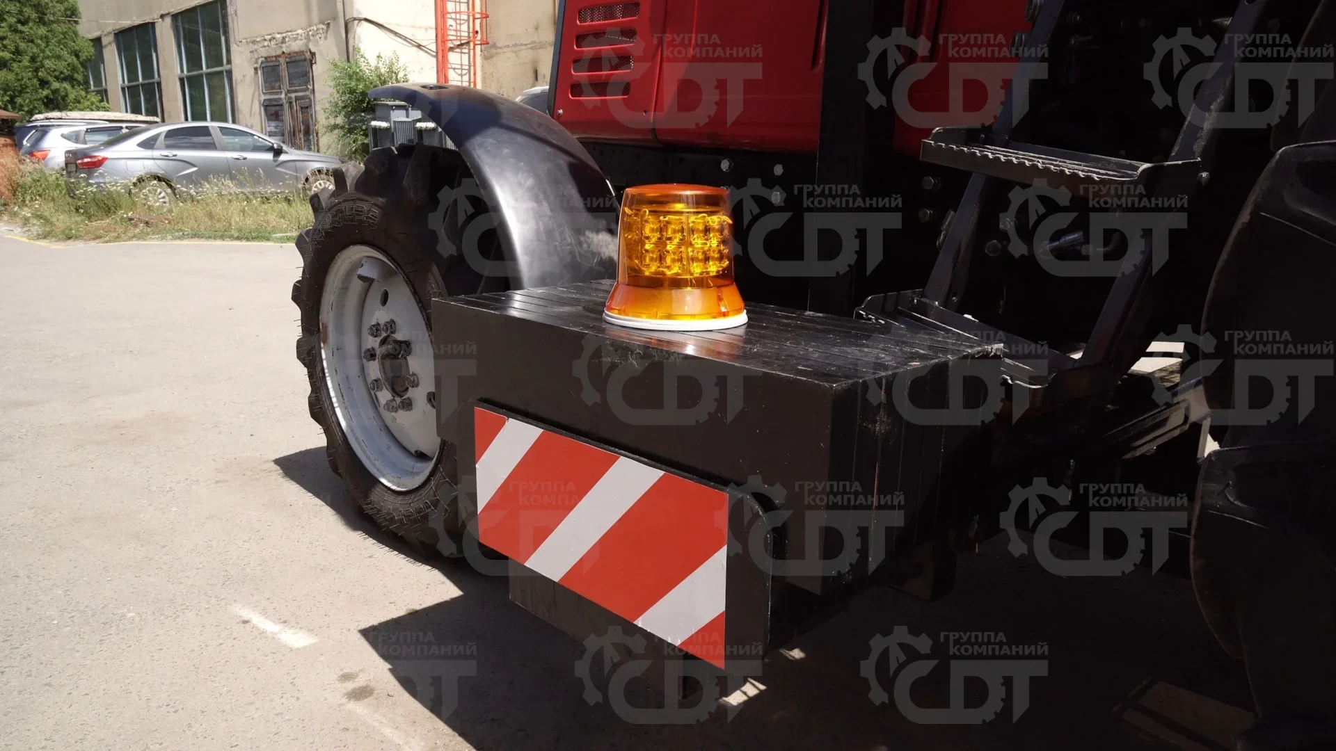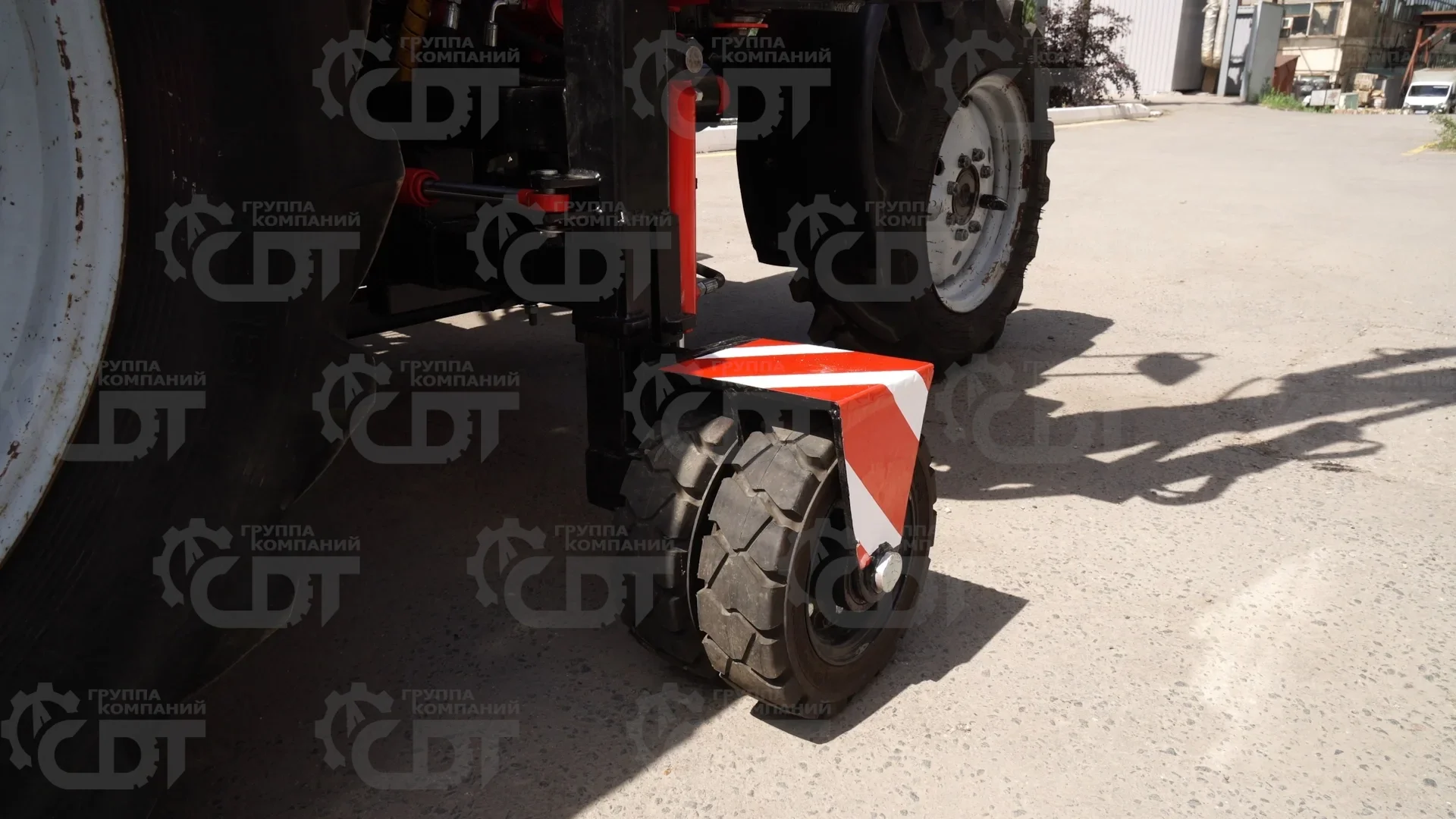 Опорное колесо и грузы-противовесы увеличивают устойчивость трактора при работе с максимальным вылетом стрелы манипулятора; Повышаются условия обеспечения техники безопасности при работах;
