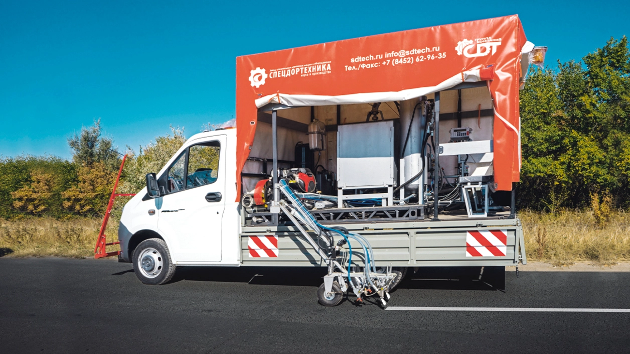 Маркировочное оборудование размещается на съемной платформе-модуле, что позволяет использовать базовый автомобиль для других целей в период, когда разметочные работы не выполняются. Оборудование можно установить на любое шасси с грузоподъемностью более 1,5 тонн.