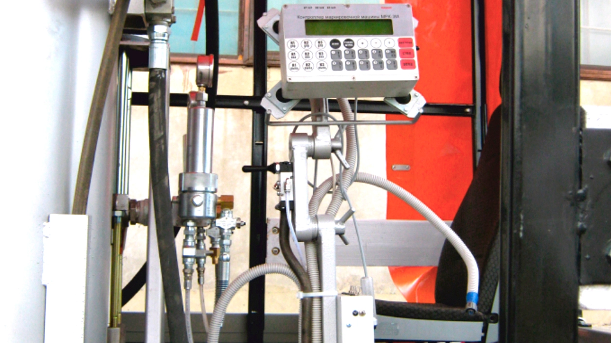 На всех разметочных машинах установлен компьютерный блок управления, обеспечивающий нанесение линий согласно требованиям ГОСТ Р 51256-2018 в автоматическом, полуавтоматическом и ручном режимах. Блок управления осуществляет расчет объемов расхода материала и площади окрашенной поверхности с занесением данных в электронный журнал выполнения работ