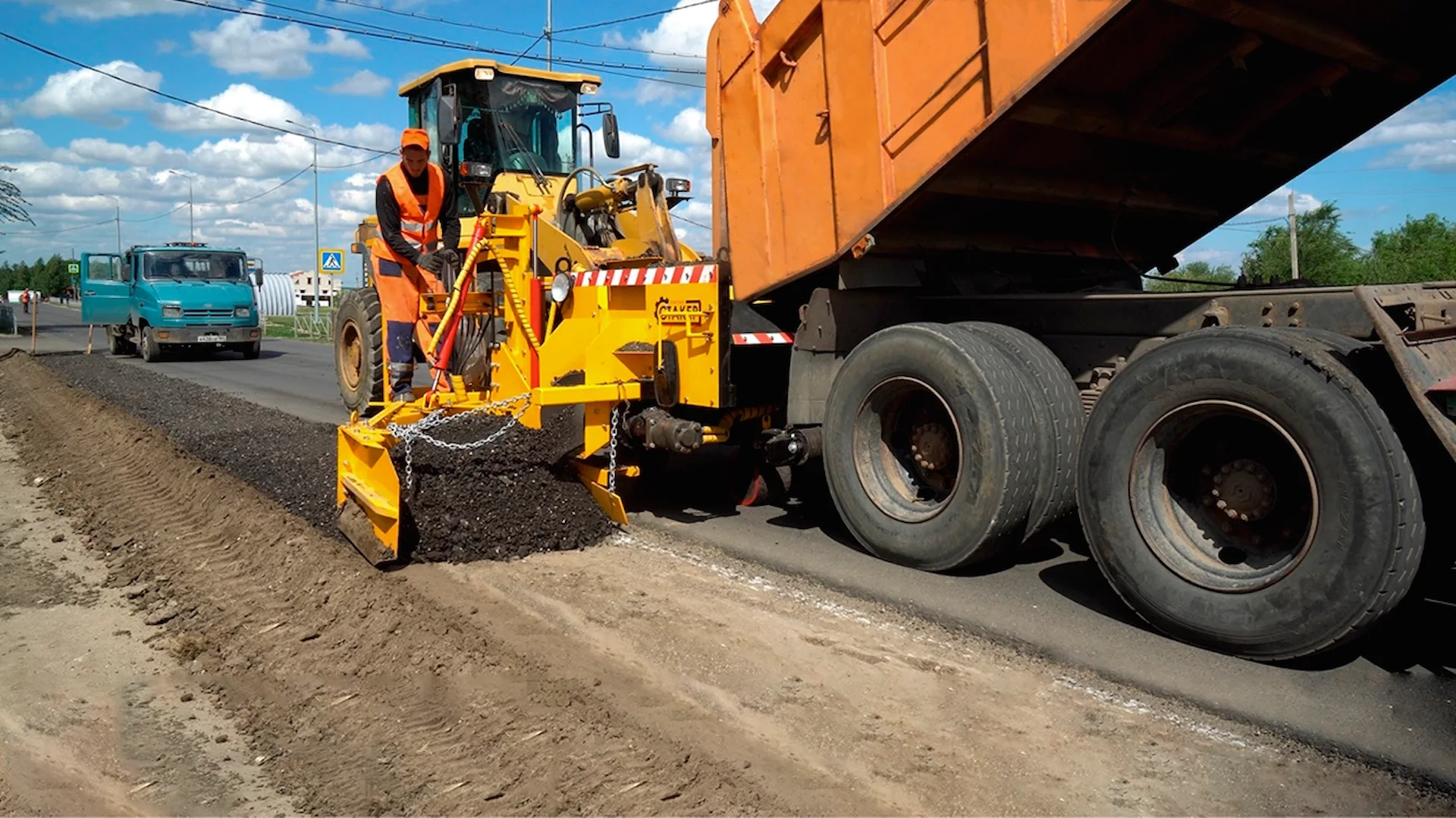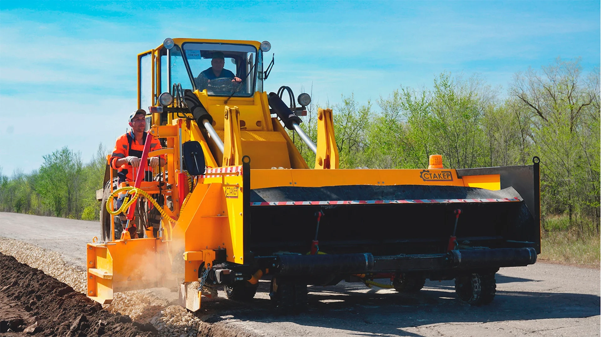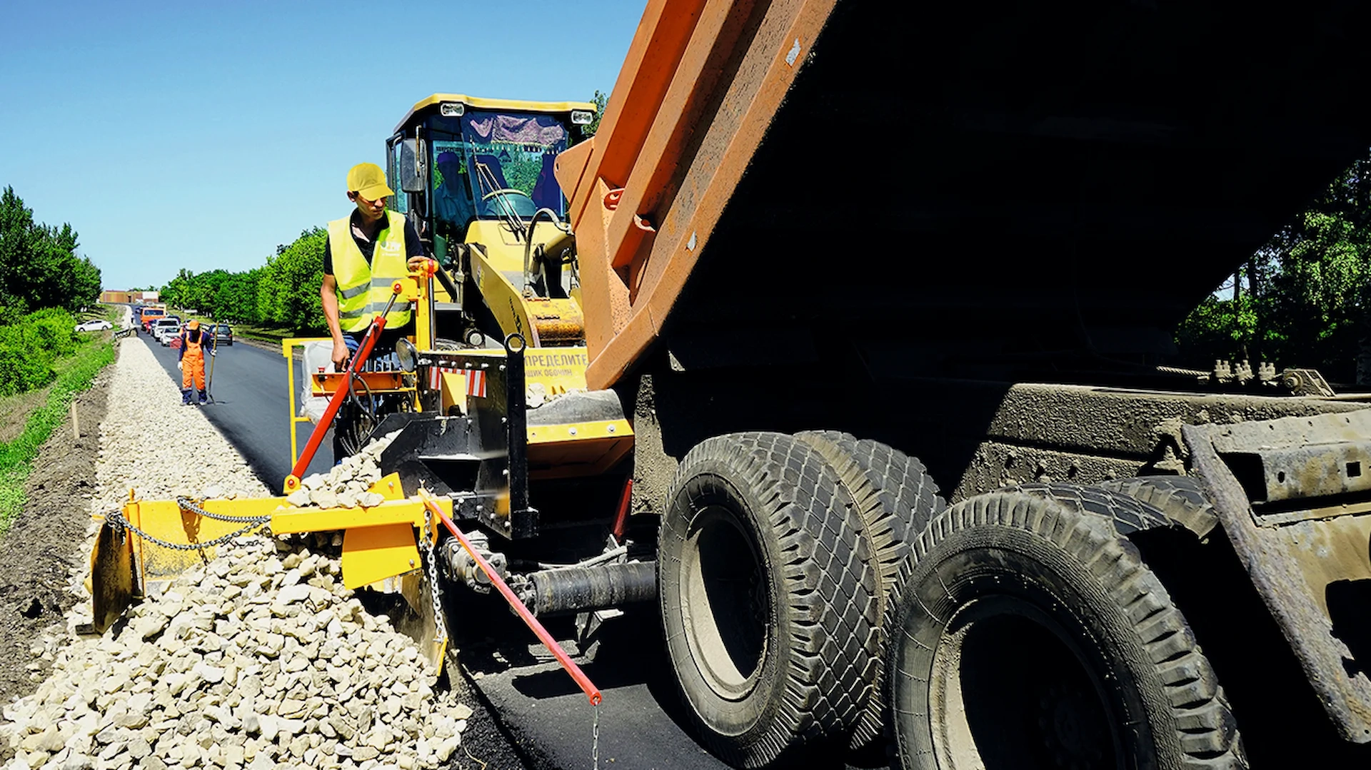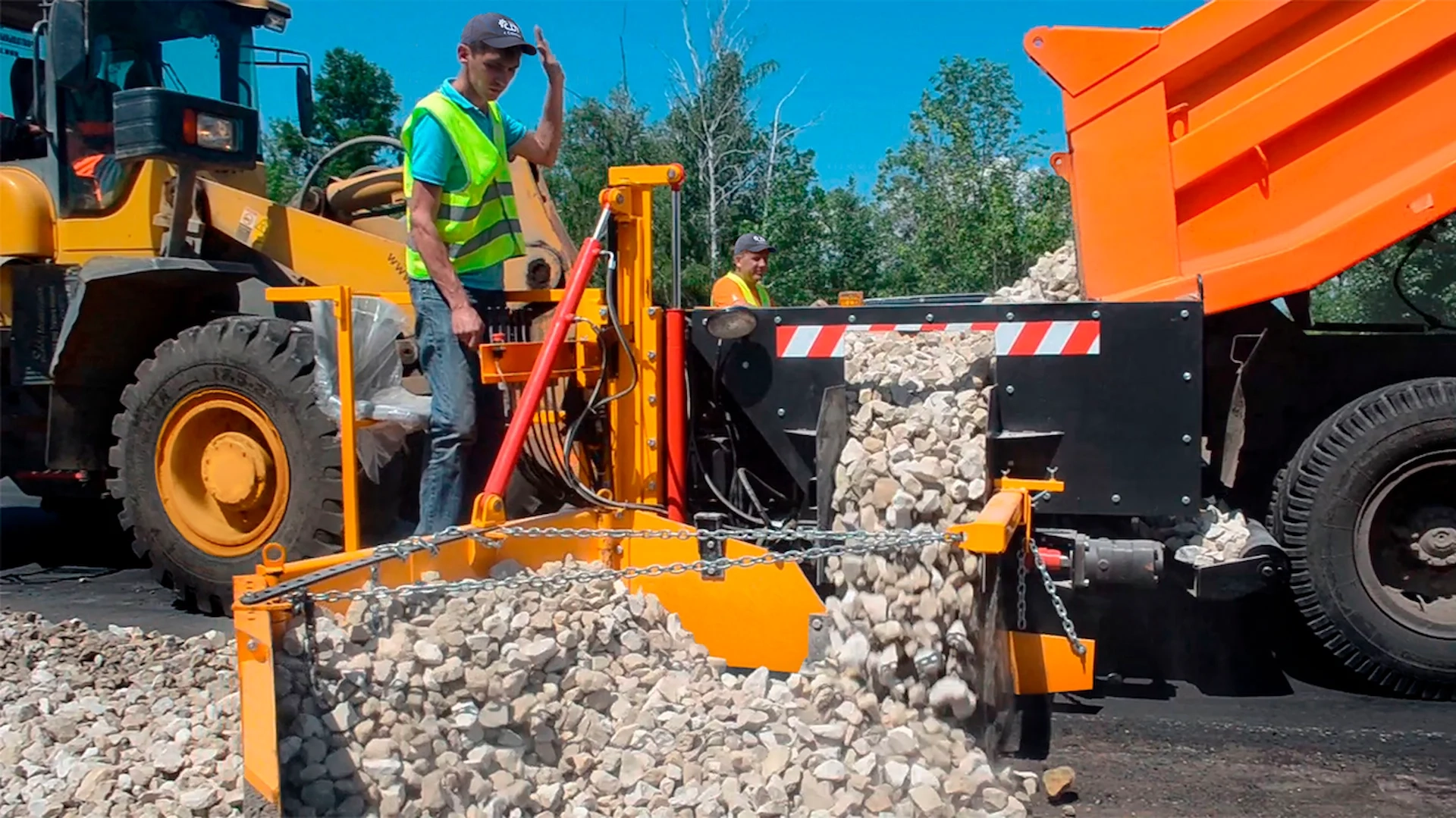 Распределение инертных материалов (щебня, песка, ПГС), а также холодных и горячих смесей с t° до 200°С, при укреплении обочин, уширении оснований проезжей части.