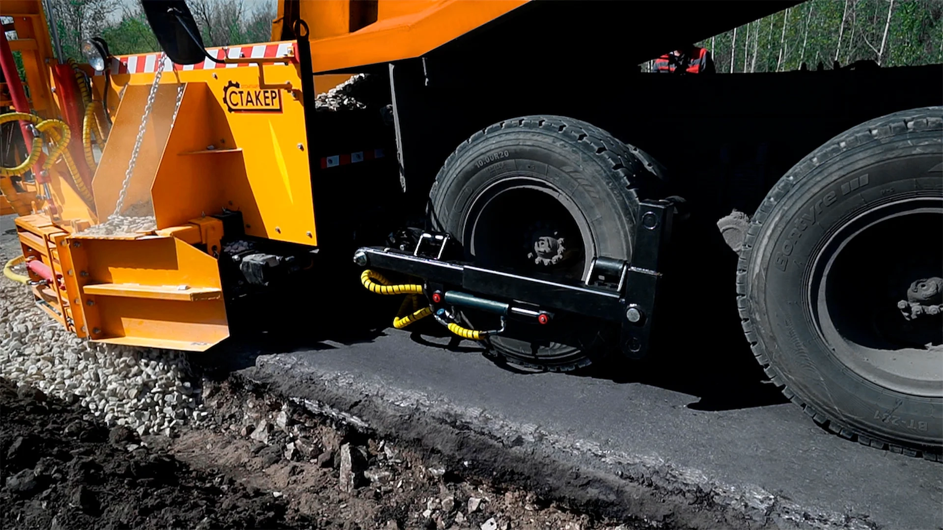Перемещается по дороге на колесах фронтальным погрузчиком или при помощи специальных захватов за самосвал. Машина адаптируется под любую спецтехнику с использованием специальных кронштейнов крепления. Упирается в колеса заднего моста либо в бампер самосвала выдвижной упорной балкой. Оборудование может быть использовано с различными типами самосвалов, имеется возможность изменения геометрии бункера с учетом высоты кузова. Распределение материала регулируется по ширине, толщине слоя и поперечному уклону.
