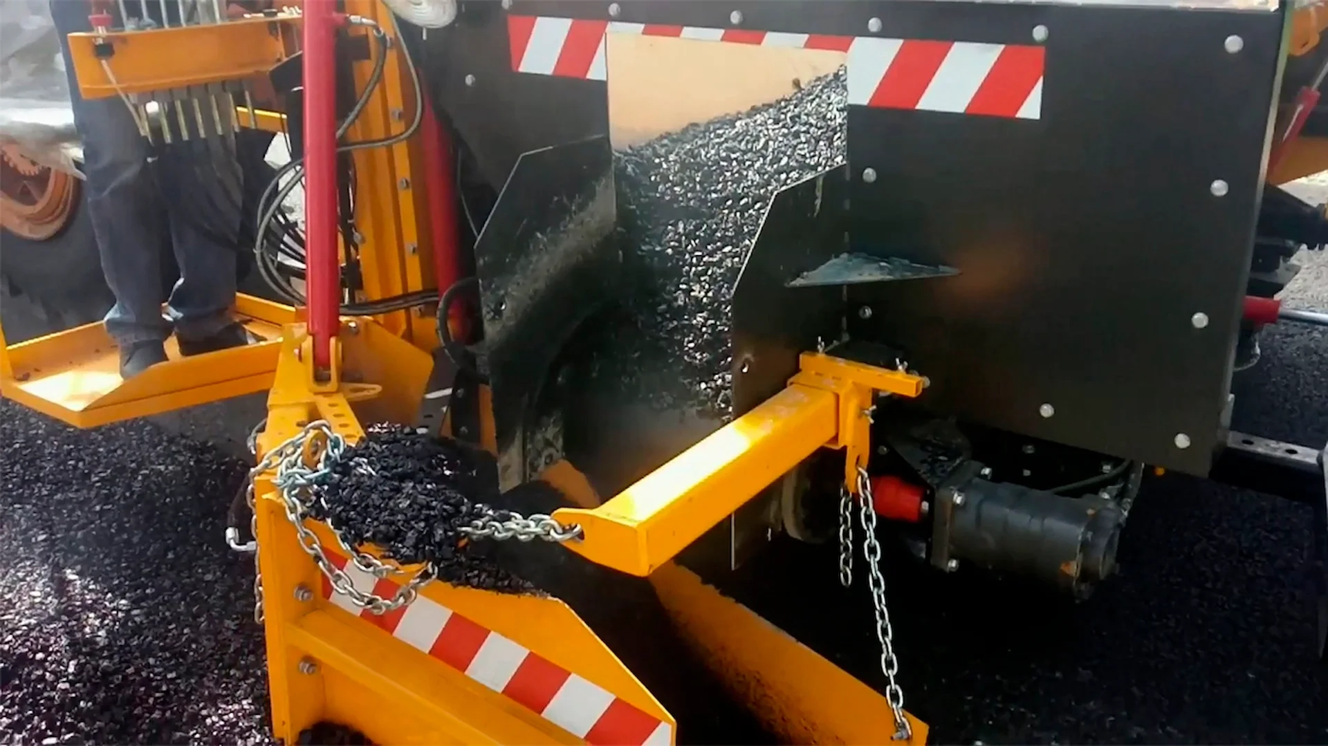 При работах по укреплению обочин, автосамосвал с щебнем подъезжает к отсыпщику и упирается задними колесами в выдвижные буфера отсыпщика обочин. Поднимается кузов, и щебень начинает сыпаться в бункер отсыпщика. Фронтальный погрузчик начинает движение, толкает отсыпщик, а вместе с ним и автосамосвал. У отсыпщика включается транспортерная лента, которая выгружает щебень на укрепляемую обочину.