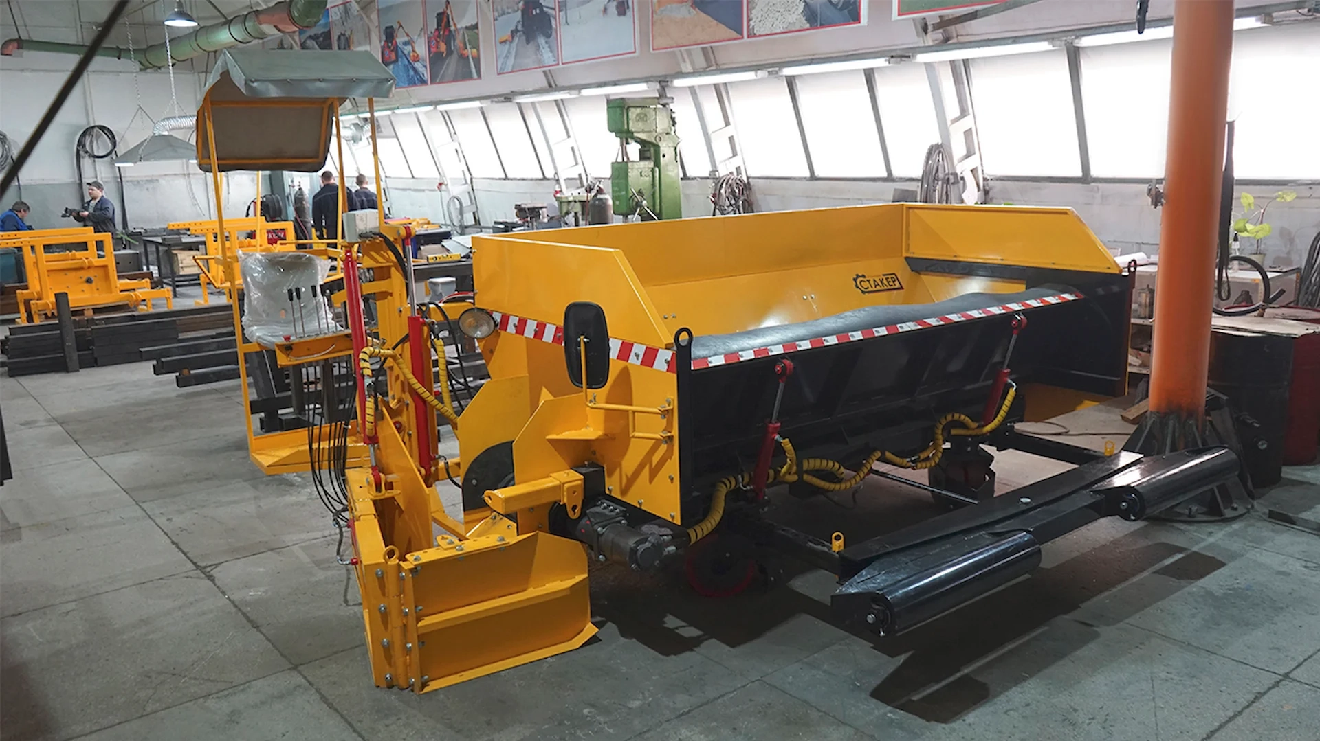 Комплектуется фарой, проблесковым маячком и креслом оператора. Может устанавливаться тент для оператора, а также щетка, обеспечивающая сметание просыпанного материала с покрытия дороги.