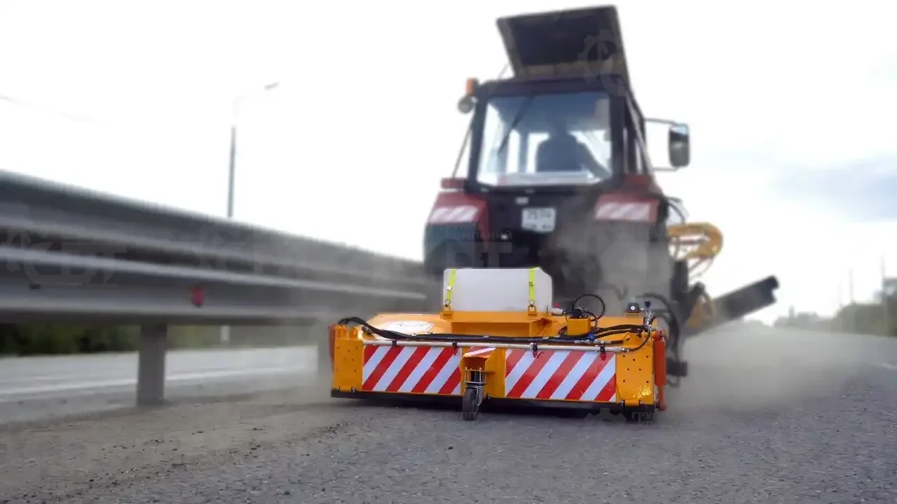 Для качественного подметания территории вблизи бордюров и в других труднодоступных местах щетка с бункером укомплектована специальной лотковой щеткой (опция). Для влажной уборки установлена специальная система обеспыливания с подачей воды (опция) , система в процессе подметания значительно уменьшает пылеобразование в летний период. Установлены опорные колеса для плавной работы щетки на местности.