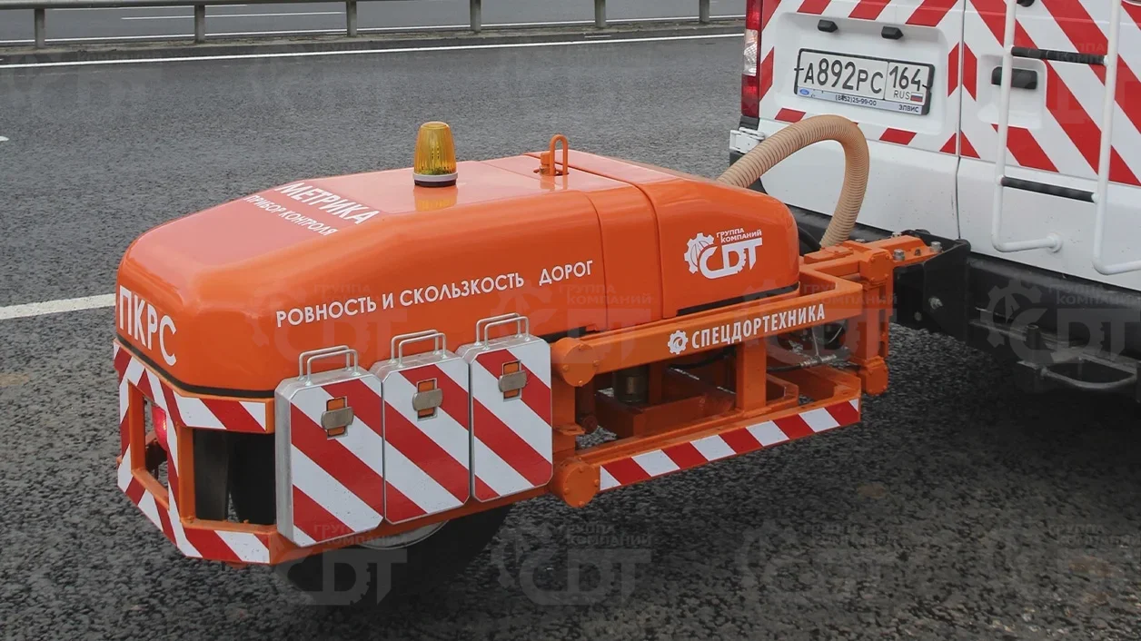 Модернизированный одноколесный динамометрический прицеп, соответствующий требованиям ГОСТ 33078-2014. Установка оснащена системой увлажнения покрытия, механизмом торможения с контролем блокировки колеса и измерительными датчиками для оценки сцепных качеств и ровности дорожного покрытия.