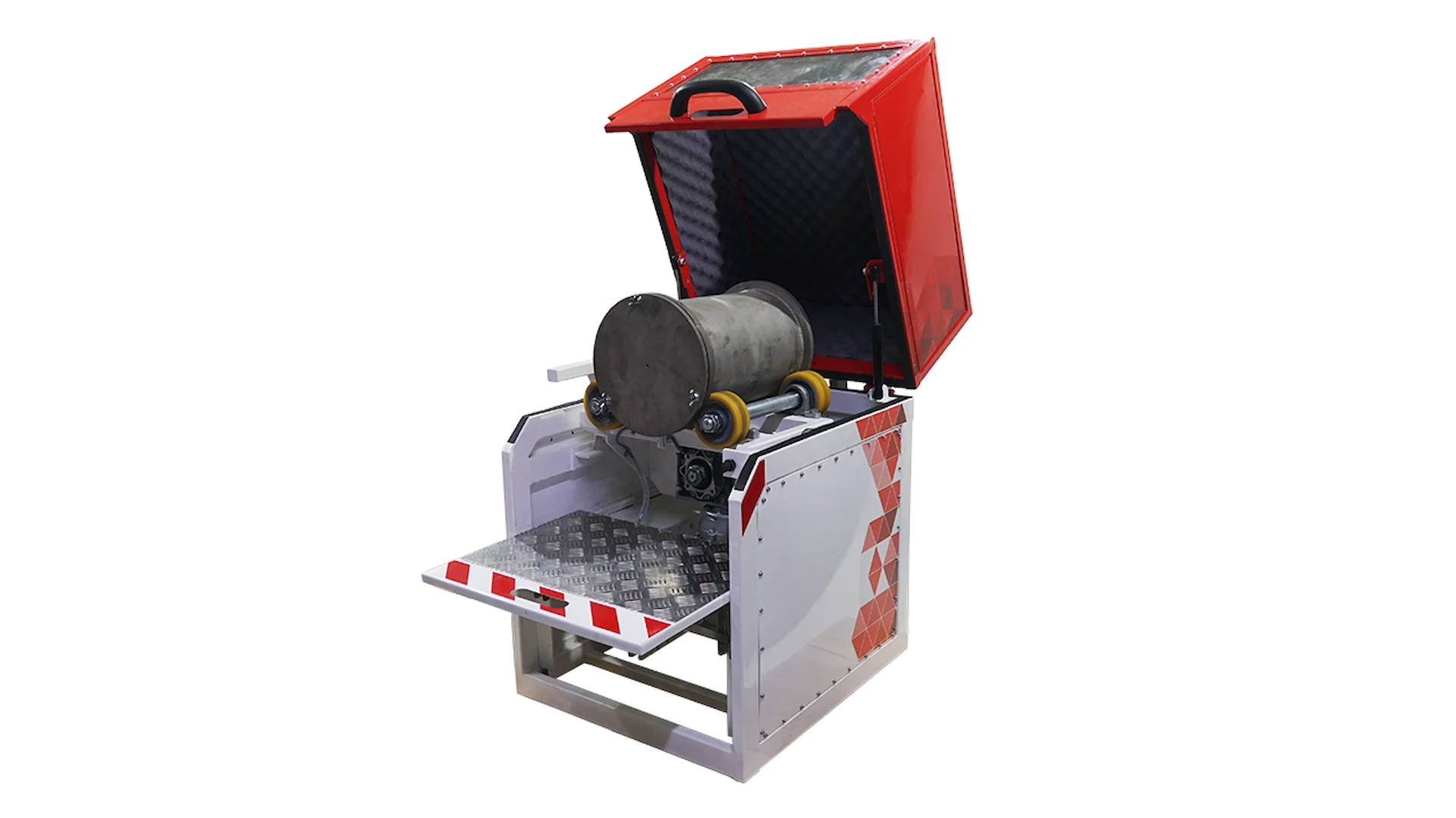 Установка представляет собой металлическую раму с электроприводом, оборудованную защитным кожухом с покрытием шумоизоляционным материалом и антивибрационными опорами, в рабочей зоне, которой возможна установка двух барабанов с внутренней длиной 154±1 мм или одного барабана с внутренней длиной 335±1 мм. Рабочая платформа имеет возможность наклона на ±30°